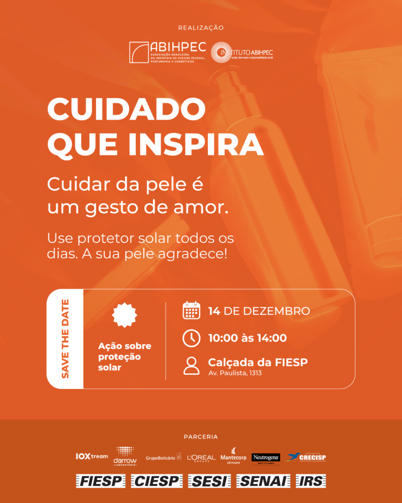 No próximo dia 14 de dezembro, das 10h às 14h, a ABIHPEC e o @institutoabihpecoficial, em parceria com o @decomsaudefiesp da Fiesp e do Ciesp, realizarão uma ação especial de conscientização sobre proteção solar e prevenção do câncer de pele, em frente ao prédio da Fiesp (Av. Paulista, 1313).